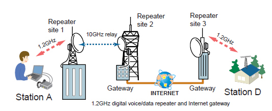 When D-STAR repeaters are connected with the Internet gateway, the D-STAR system relays the received data over the Internet. Microwave links and Internet gateways can be combined even during one contact. Your message will get through to anywhere in the D-STAR system.